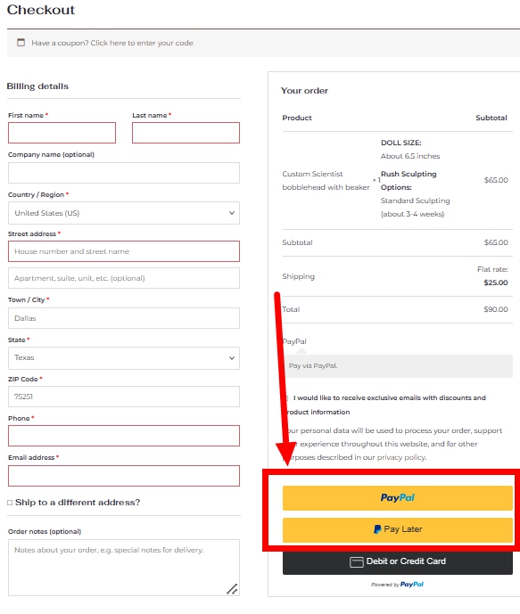 You can pay for custom bobblehead dolls through Paypal, which is one of the safest and most convenient payment methods.