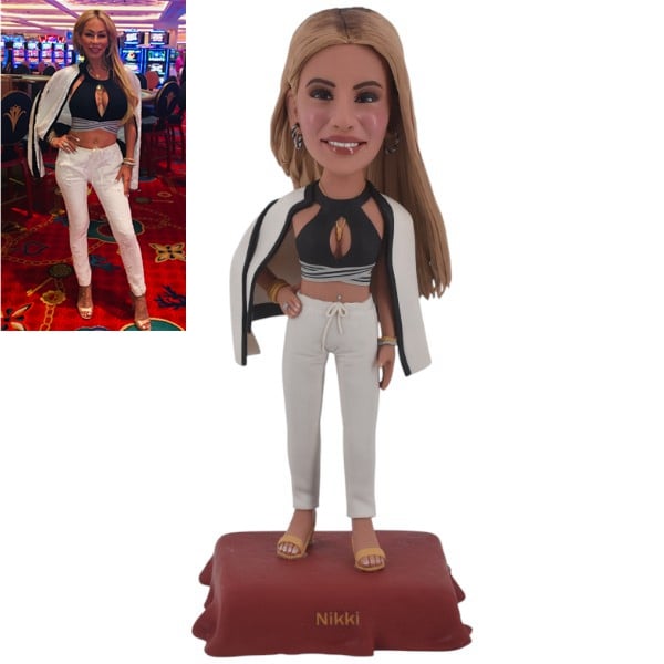 You have two options when it comes to clothing for your order. You can choose to have it made to look exactly like the model on our website or you can select "I need changes to outfit/posture" for an additional $10 and we will customize it to match your photos. In case you don't have any pictures, please leave a detailed description of the clothing you want in the comment box. Please be aware that if you go with our fully custom options, we craft the bobblehead from head to toe, and there's no additional charge for custom clothing!