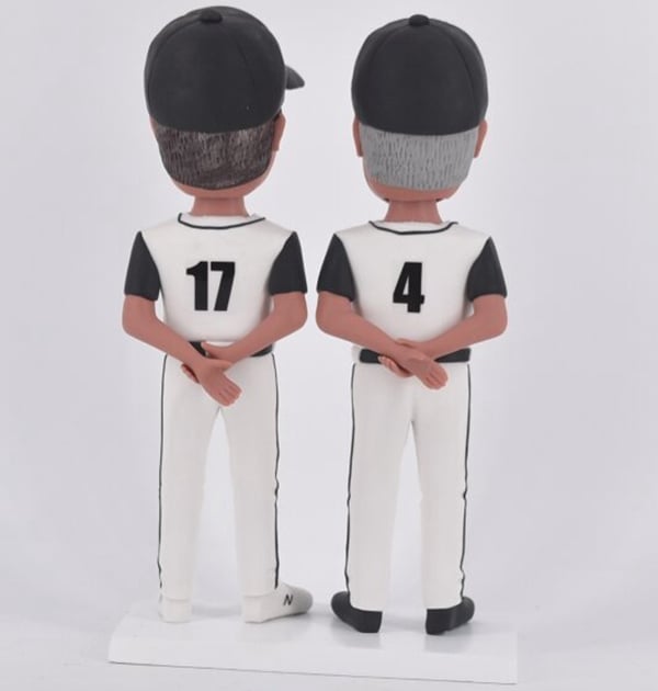 At no added cost, we provide the option to include small accessories to your bobblehead, such as rings, ties, necklaces, earrings, hats, crowns, nose ring and etc. If you opt for a sports model, we are happy to add a number, name, or logo and ensure that the clothing resembles your team's uniforms.