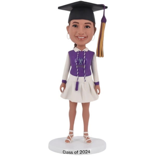 Have a glance at these charming graduation bobbleheads! We designed the gowns based on your photos, resulting in an adorable and realistic appearance.