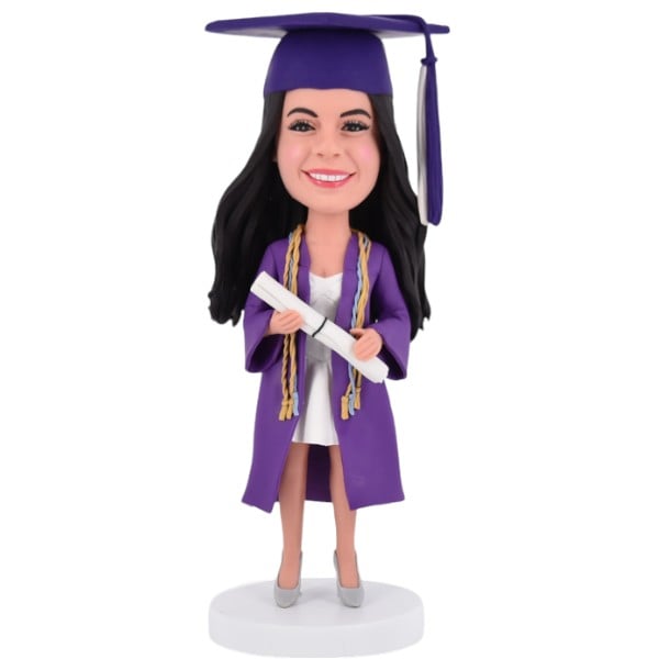 Have a glance at these charming graduation bobbleheads! We designed the gowns based on your photos, resulting in an adorable and realistic appearance.