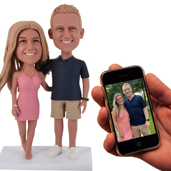 Typically, we will make the posture same as the body model you choose. However, we offer various other postures such as sitting in chairs or on the floor, lying, squatting, leaning, or kneeling. If you order a two-person bobblehead, we can customize it by making them hold hands if they are a couple, or have the groom holding the bride, or two men crossing their arms. We can create any posture that you can imagine.