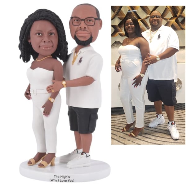 When it comes to wedding bobblehead cake toppers, most couples prefer to have them donning the same outfits they wore on their big day. If you have any pictures showcasing your attire, please upload them in order for replication. Alternatively, if you plan on creating bobbleheads before your wedding and do not have photos, you may provide us with a detailed description of your attire, and we will use our expertise to produce the perfect replica. Additionally, we offer an array of themed options, such as sporty, beach, casual, and humorous styles that you can choose from. If you require any guidance in selecting the ideal clothing or posture for your bobbleheads, our team is always available to provide assistance at [email protected]. Check out some of our past examples below.