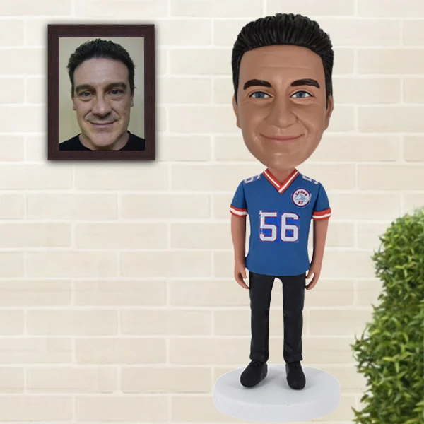 You have two options when it comes to clothing for your order. You can choose to have it made to look exactly like the model on our website or you can select "I need changes to outfit/posture" for an additional $10 and we will customize it to match your photos. In case you don't have any pictures, please leave a detailed description of the clothing you want in the comment box. Please be aware that if you go with our fully custom options, we craft the bobblehead from head to toe, and there's no additional charge for custom clothing!